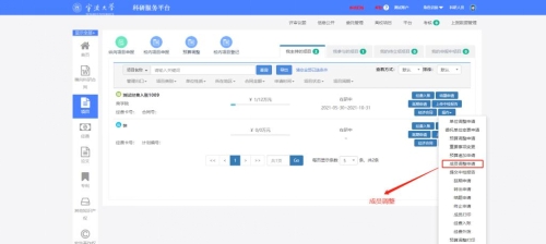 ,左侧的项目界面,点击操作下拉框下的成员调整申请,进入成员调整界面进行添加和修改,待项目主管审核之后,会自动补充到项目经费公开一览表,最后再提交即可。