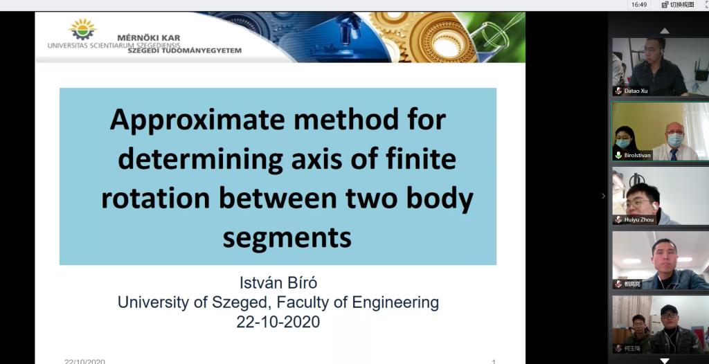 Bíró 教授以“生物力学研究”为主题,深入探究膝关节相对运动特性,并确定股骨及胫骨间有限转动轴的近似方法。教授对膝关节生物力学领域的研究深入且与时俱进,给我院师生带来了很大的启发。在讲座的互动环节中也热情地回答了师生们的提问。同学们对此次“云讲堂”纷纷点赞。