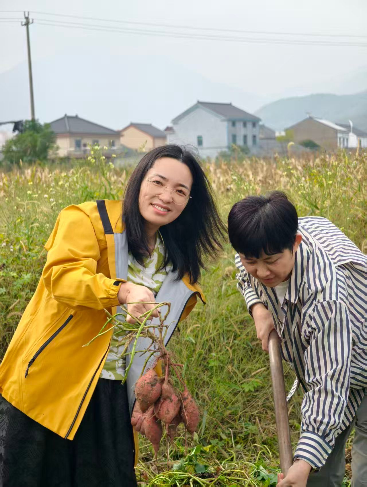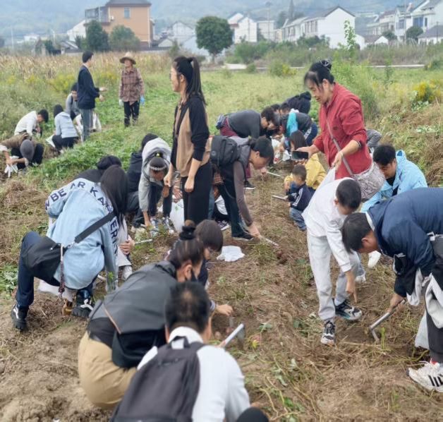 “四明三千里,物色甲东南”,四明山的秋日素来以绚烂多彩闻名,是浙江境内极具代表性的赏秋胜地。教职工们率先开启“农场巡田”环节。漫步在秋意盎然的农场田野间,金黄的稻穗、翠绿的蔬果与远处层林尽染的山峦相映成趣,大家纷纷拿出手机、相机,定格下秋日农场的鲜活景致,感受着远离城市喧嚣的静谧与惬意。随后,“挖番薯”体验活动正式拉开帷幕。在农场工作人员的指引下,教职工们撸起袖子、拿起小铲子,深入番薯田开启“寻宝”之旅。